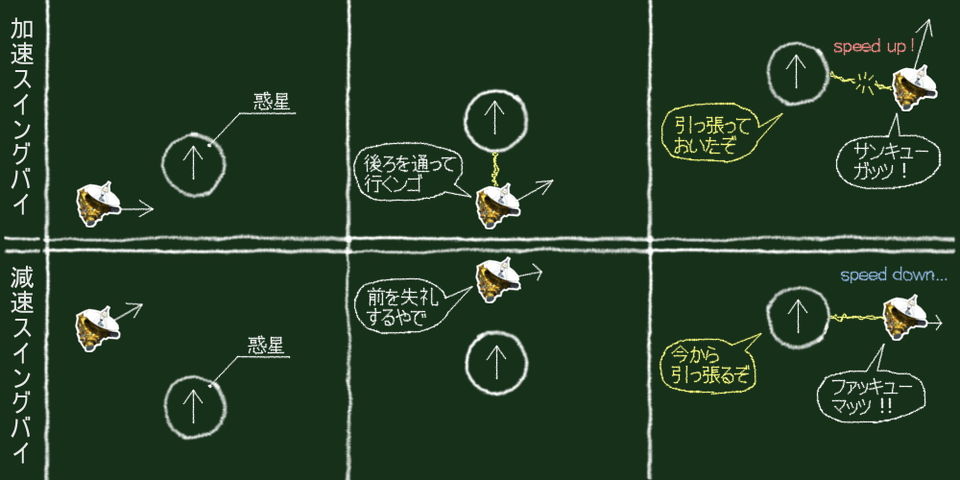 太陽から離れるのは坂を登るようなもんやから、天体の重力で引っ張って貰って加速できるのは大きなメリットなんや。」