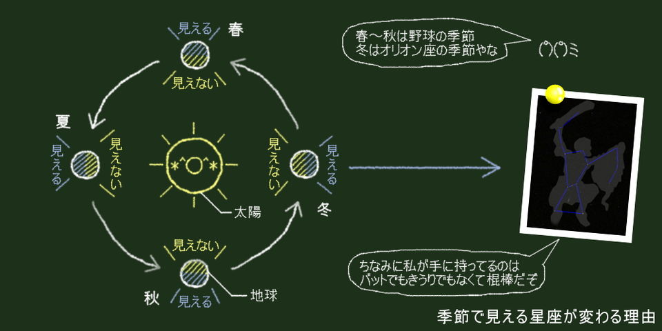 彡(゚)(゚)「その季節の昼の方向にある星座は太陽に邪魔されて見えず、逆に夜の方向にある星座は見やすくなるわけや」